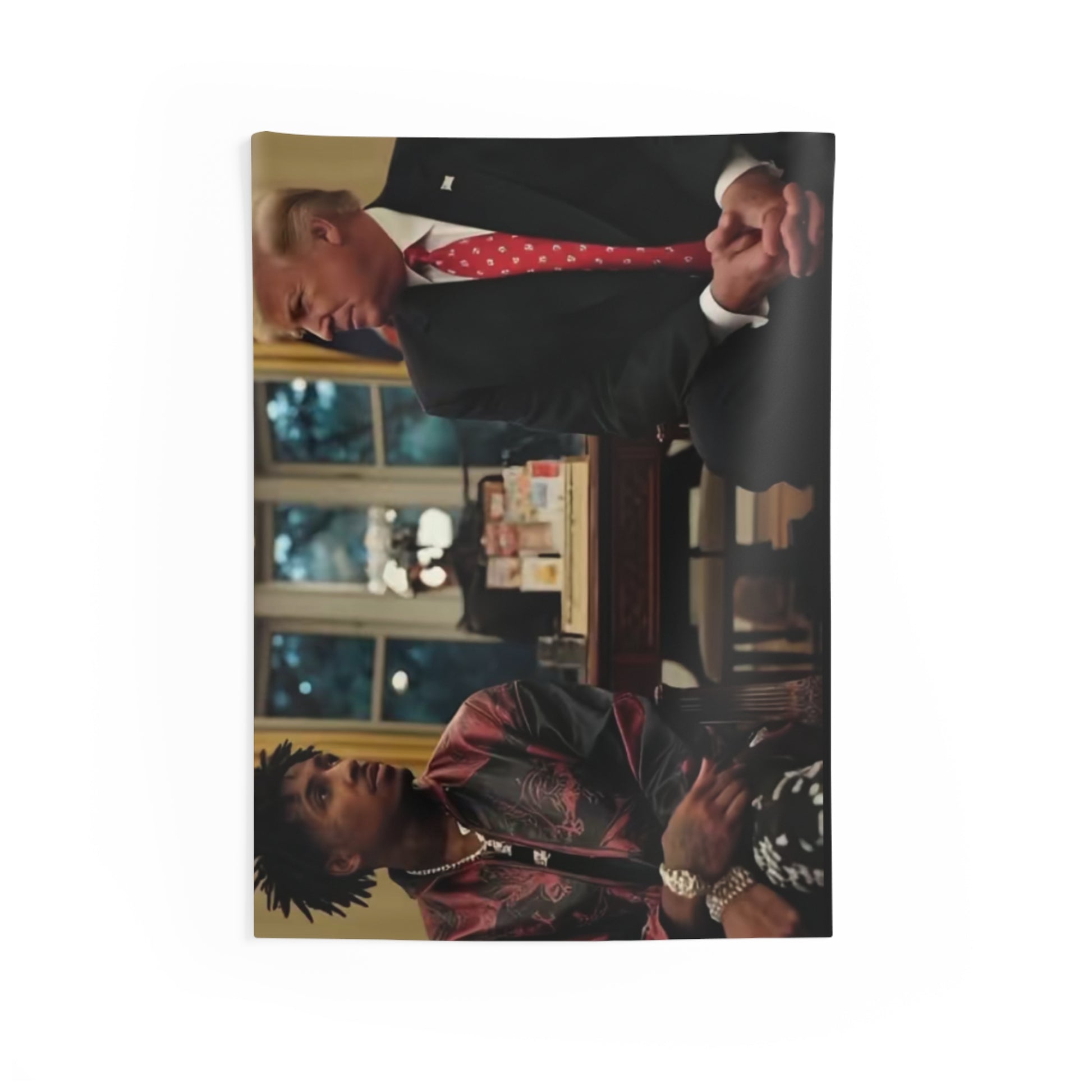 Step into history with a twist — the Presidential Drip Tapestry captures a surreal moment where politics meets the culture. Featuring a hyper-realistic, high-definition image of Donald Trump and NBA YoungBoy seated together in the Oval Office, this piece turns any room into a conversation starter.